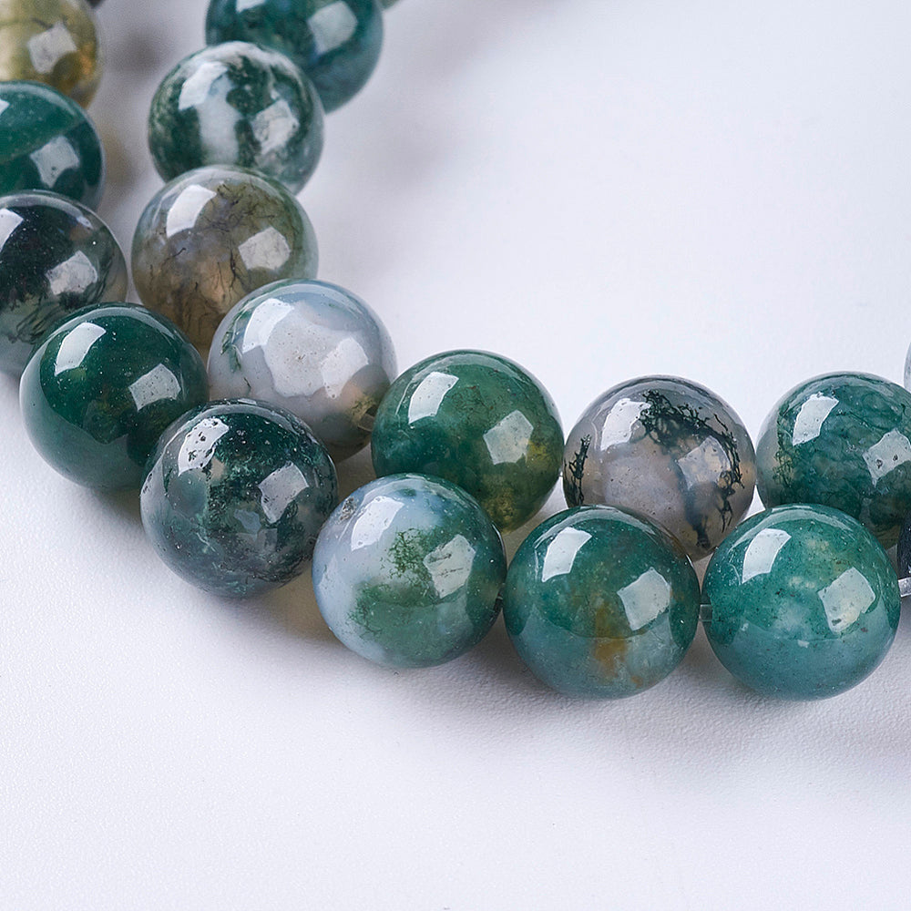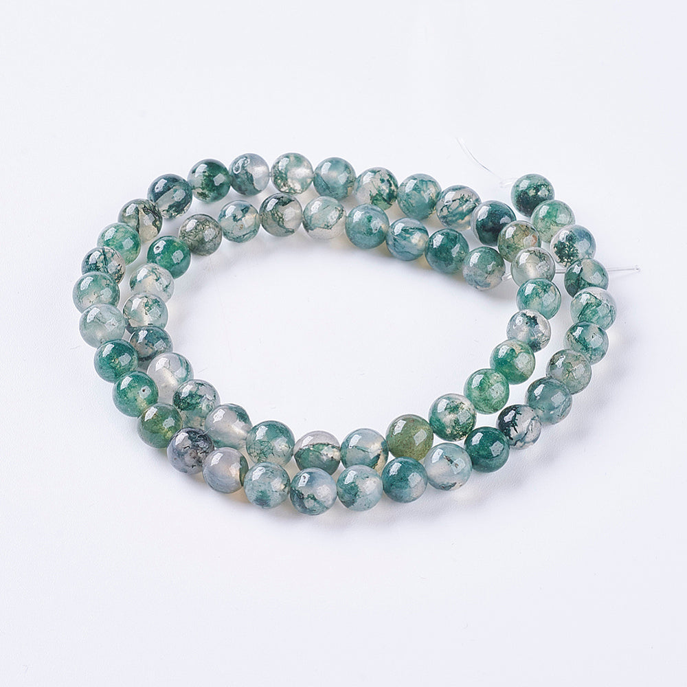 Bring natural elegance to your jewellery designs with this stunning Moss Agate strand. Each 6mm round bead showcases the distinctive green and white patterns that make moss agate a favourite among beaders and designers. With approximately 60 beads on a 37cm strand, you'll have plenty to create statement pieces or layer multiple strands for added depth. Perfect for bracelets, necklaces, or mixed-media projects, these smooth, polished beads are a versatile addition to any collection. Moss agate is believed to promote balance and grounding energy, making these beads as meaningful as they are beautiful.