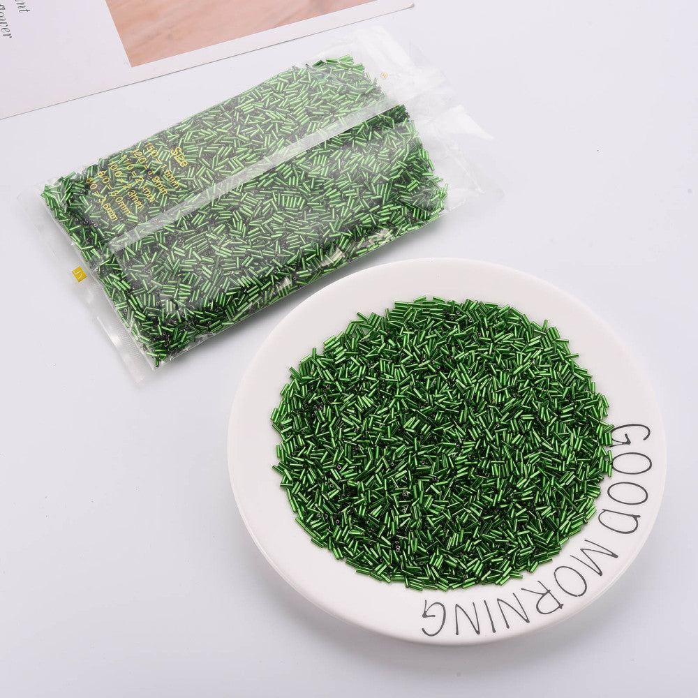 Elevate your beadwork with these shimmering glass bugle beads in a gorgeous metallic green. At 6.5x2mm, they're the perfect size for adding dimension and sparkle to bracelets, necklaces, and mixed-media designs. Buy by the gram to get exactly what you need—no waste, no fuss. Their sleek tubular shape catches light beautifully, making every stitch count. Whether you're a seasoned jeweler or exploring new creative possibilities, these versatile beauties are ready to bring your vision to life.