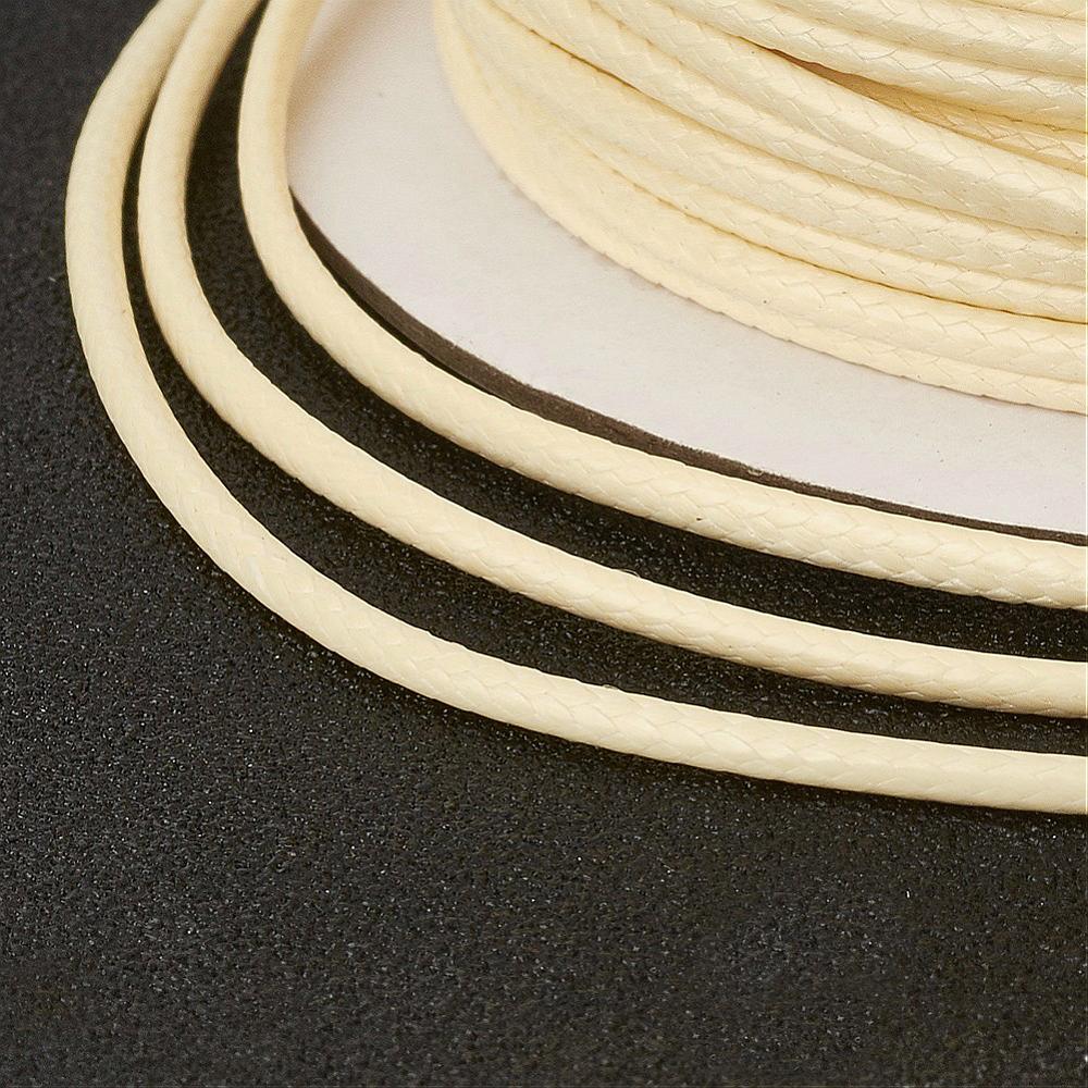 Cord Waxed Polyester Cream 1mm Per 182mtr Roll. This woven round cord contains a light wax treatment for a soft, flexible drape. It is made of polyester and knots securely. This cord is perfect for macrame and Shamballa designs. Cord sizes and colours are approximate and may vary slightly.