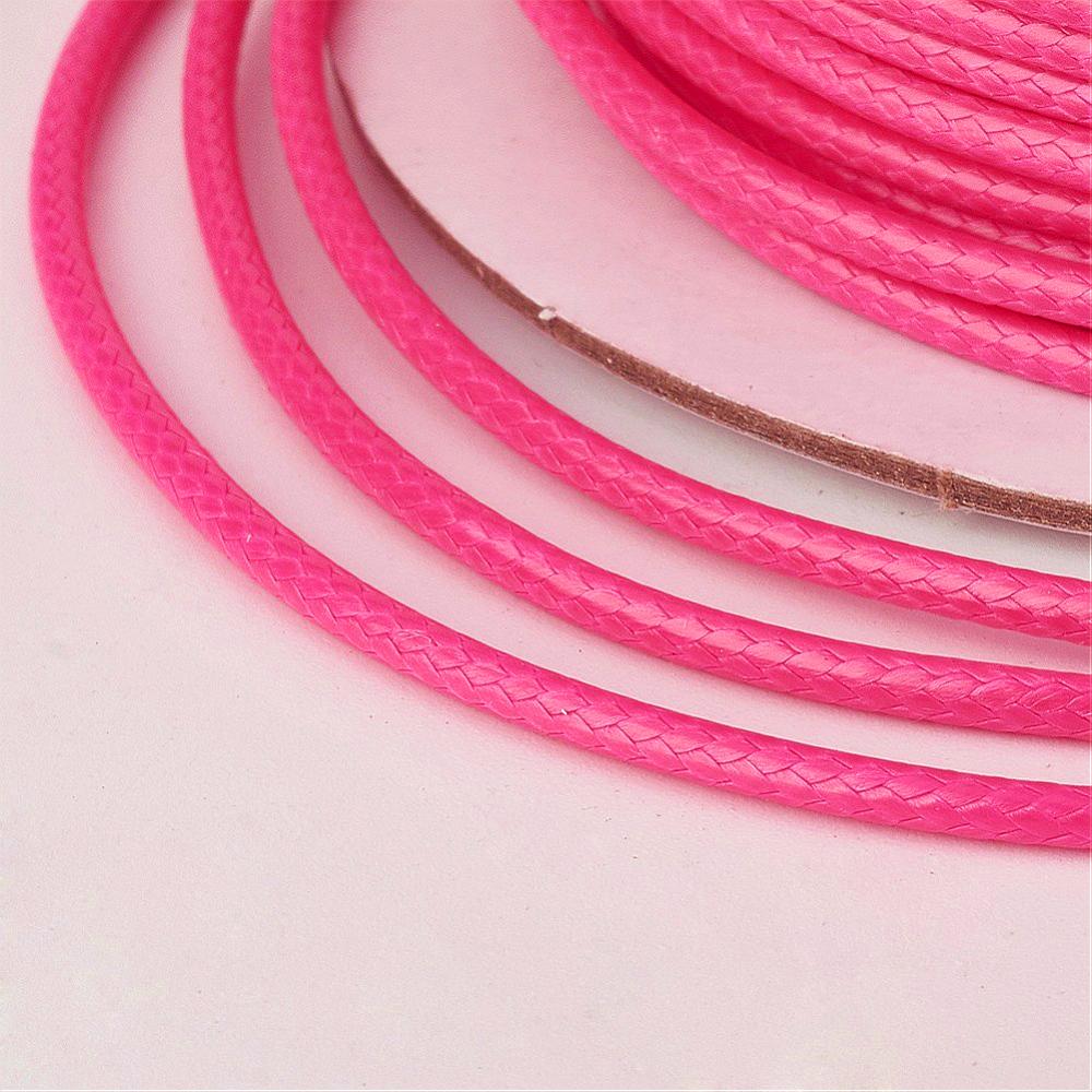 Cord Waxed Polyester Hot Pink 0.5mm Per 160mtr Roll. This woven round cord contains a light wax treatment for a soft, flexible drape. It is made of polyester and knots securely. This cord is perfect for macrame and Shamballa designs. Cord sizes and colours are approximate and may vary slightly.