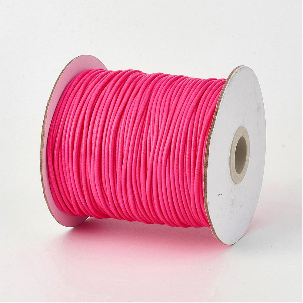 Cord Waxed Polyester Hot Pink 1mm Per 182mtr Roll. This woven round cord contains a light wax treatment for a soft, flexible drape. It is made of polyester and knots securely. This cord is perfect for macrame and Shamballa designs. Cord sizes and colours are approximate and may vary slightly.