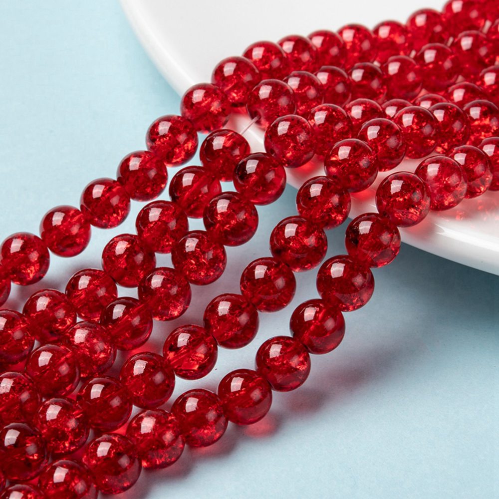 Glass Crackle 8m Round Dark Red 86cm strand approx 105 pcs per strand hole: about 1mm. Crackle beads are heated and rapidly cooled to produce internal crackles. Crackles increase light reflection inside the beads deepening the drama of colour. Size and shape may vary slightly and colour may vary from dye lot to dye lot.