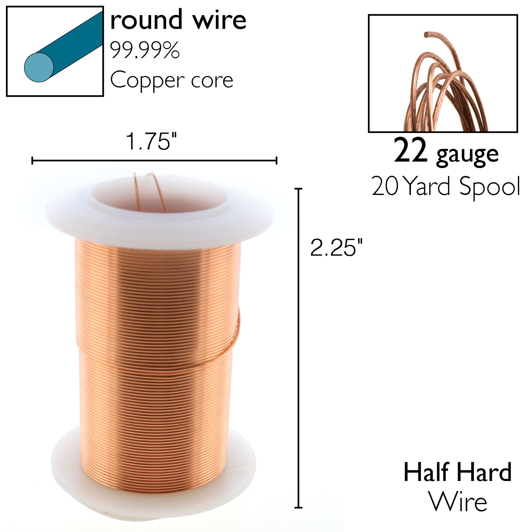 Wire Non-Tarnish Copper 22gauge 18.28m Description: Lacquered, Tarnish-Resistant Wire- Half-hard wire that’s ideal for Jewelry making, wire wrapping, crafting, scrapbooking, and much more! - 99.99% Copper core - Available in 16-28 gauge - Lead-Free, Nickel Free. Medium-temper wire is flexible and well-suited for creating components with sharp angles or that need to maintain their shape under moderate stress, such as ear wires, jump rings, or weight-bearing parts of wire-wrapped Jewelry. When used to create an element like a clasp, which will be subjected to high stress, it should be hardened after shaping. This can be done by placing it on an anvil or bench block and striking it with a nylon-jaw hammer. "