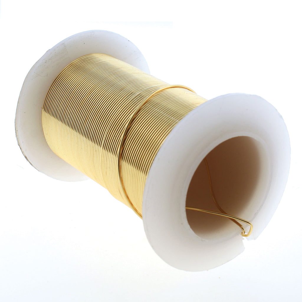 Wire Non-Tarnish Gold 24gauge 27.4m Description: Lacquered, Tarnish-Resistant Wire- Half-hard wire that’s ideal for Jewelry making, wire wrapping, crafting, scrapbooking, and much more! - 99.99% Copper core - Available in 16-28 gauge - Lead-Free, Nickel Free. Medium-temper wire is flexible and well-suited for creating components with sharp angles or that need to maintain their shape under moderate stress, such as ear wires, jump rings, or weight-bearing parts of wire-wrapped Jewelry. When used to create an element like a clasp, which will be subjected to high stress, it should be hardened after shaping. This can be done by placing it on an anvil or bench block and striking it with a nylon-jaw hammer. "
