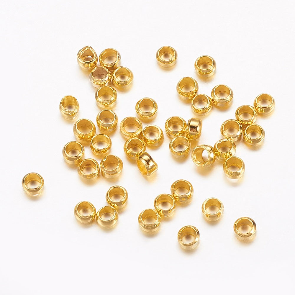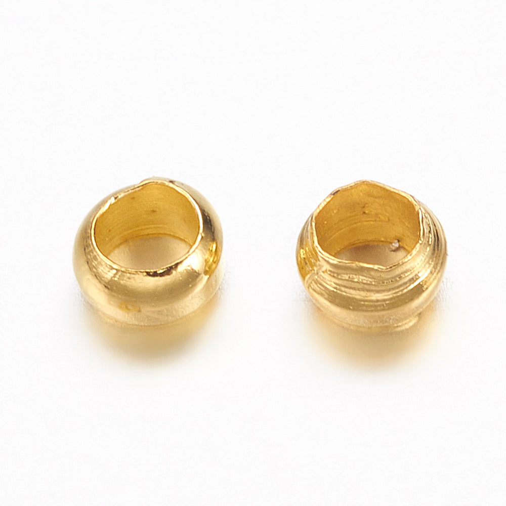 Crimp beads are soft metal beads used in place of knots to secure clasps and beads onto un-knottable stringing material such as beading wire. To use crimps, you will need some flat nose pliers to squash the crimps, or speciality crimping pliers that "fold" the bead into a small volume. First, thread crimp onto wire.