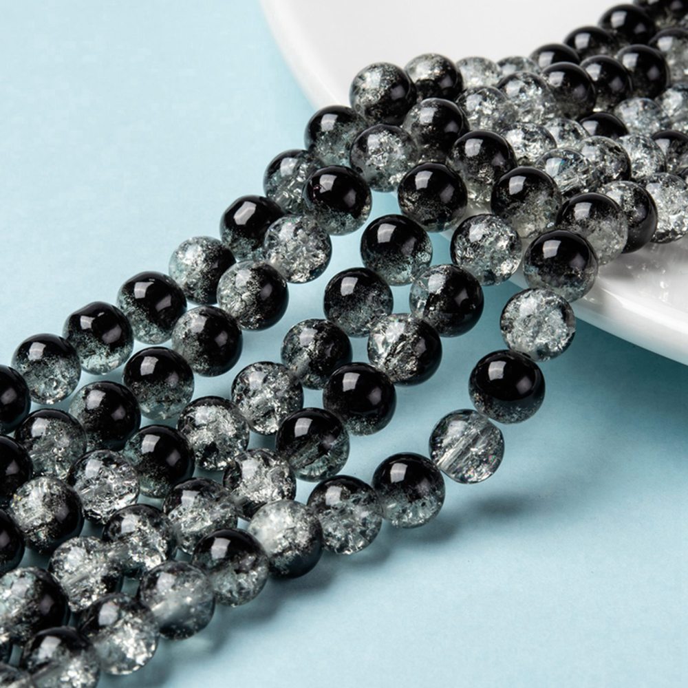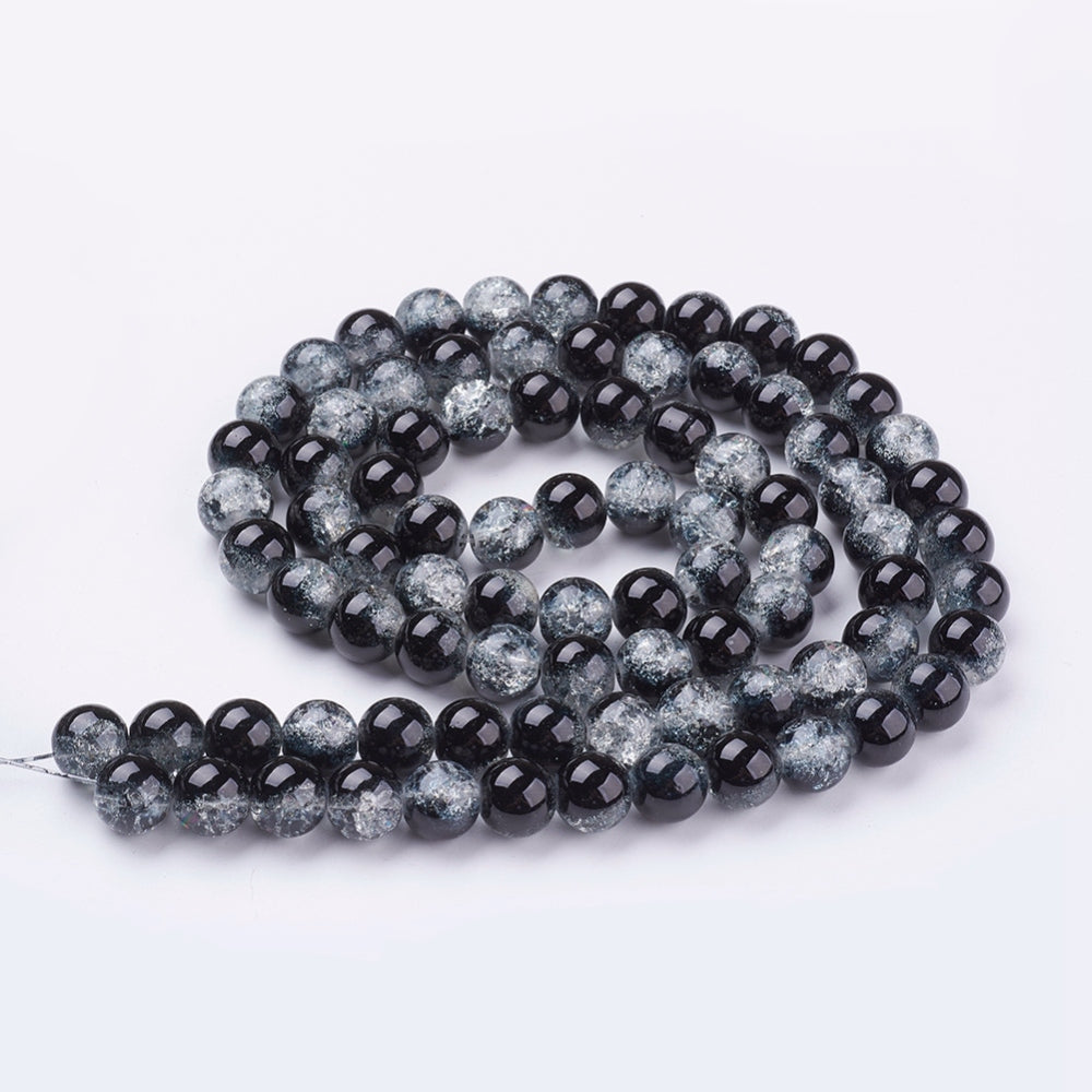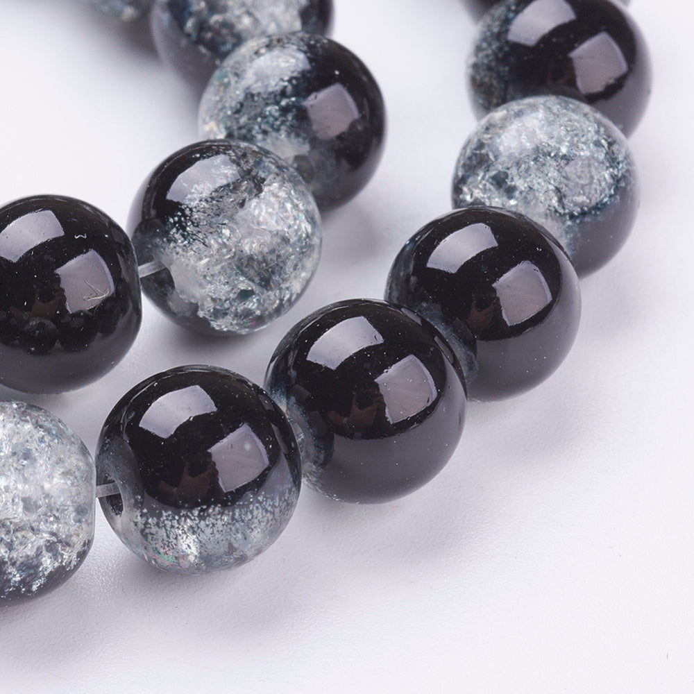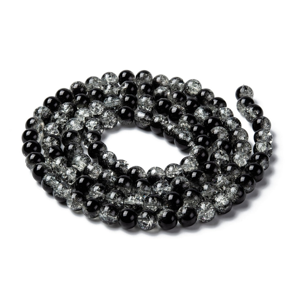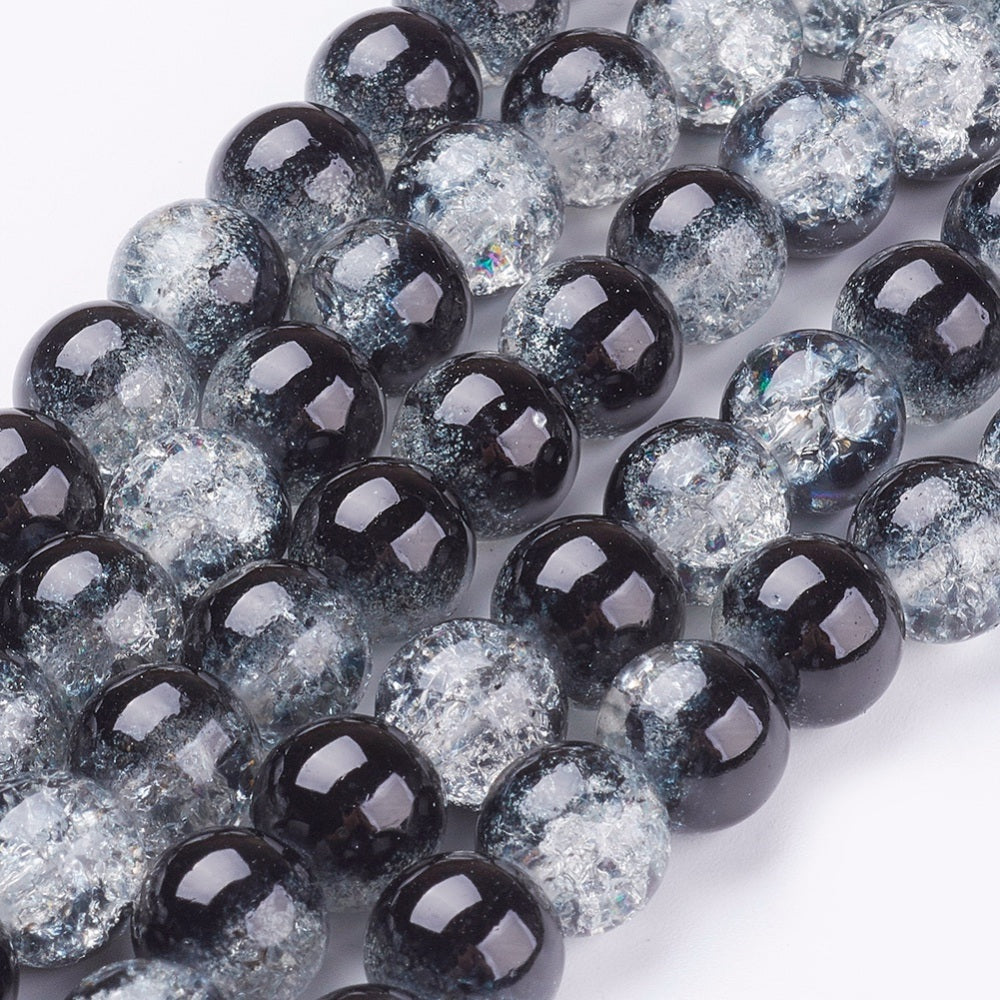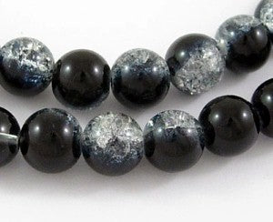 Glass Crackle 10m Round Black/Clear 86cm strand approx 89pcs per strand hole: about 1mm. Crackle beads are heated and rapidly cooled to produce internal crackles. Crackles increase light reflection inside the beads deepening the drama of colour. Create a dramatic style with crackle beads.