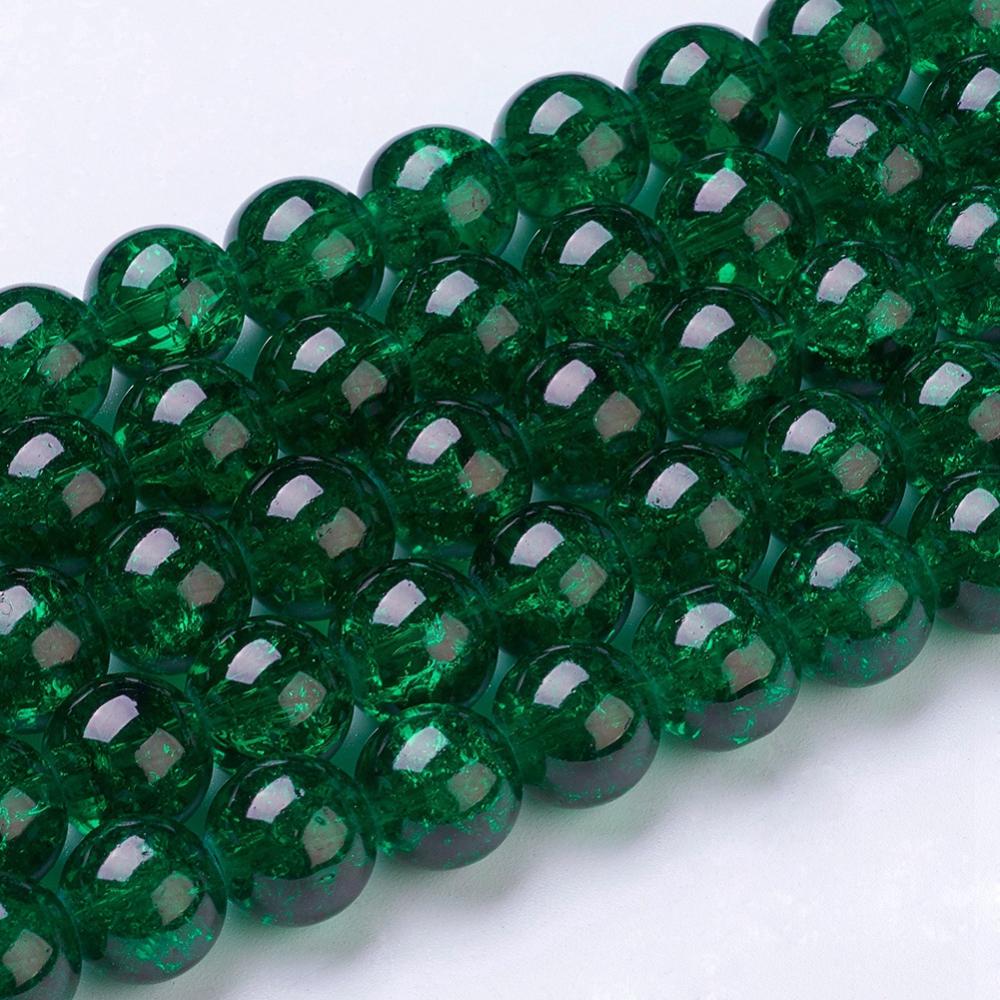 Glass Crackle 10m Rnd Green 86cm strand approx 89pcs per strand hole: about 1mm. Crackle beads are heated and rapidly cooled to produce internal crackles. Crackles increase light reflection inside the beads deepening the drama of colour. Size and shape may vary slightly and colour may vary from dye lot to dye lot.
