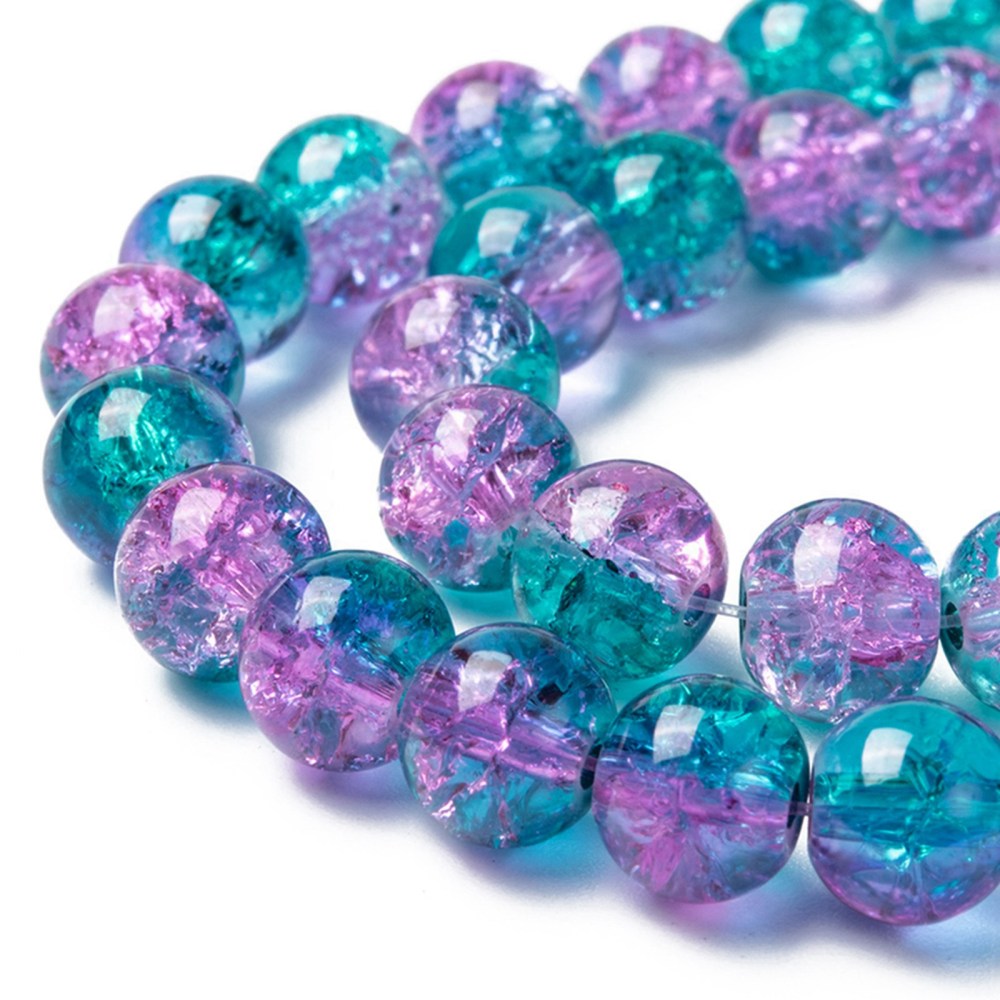 Glass Crackle 6m Rnd Pink/Blue 86cm strand approx 140 pcs per strand hole: about 1mm. Crackle beads are heated and rapidly cooled to produce internal crackles. Crackles increase light reflection inside the beads deepening the drama of colour. Size and shape may vary slightly and colour may vary from dye lot to dye lot.