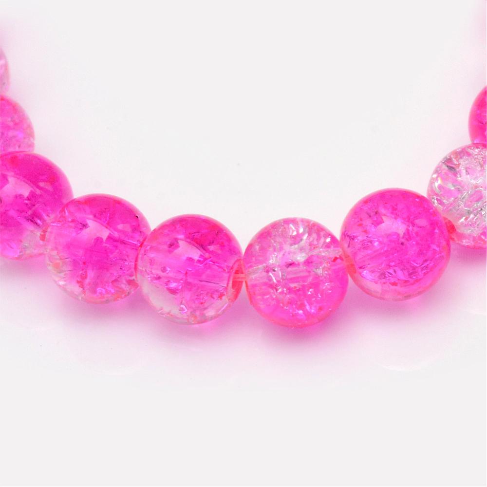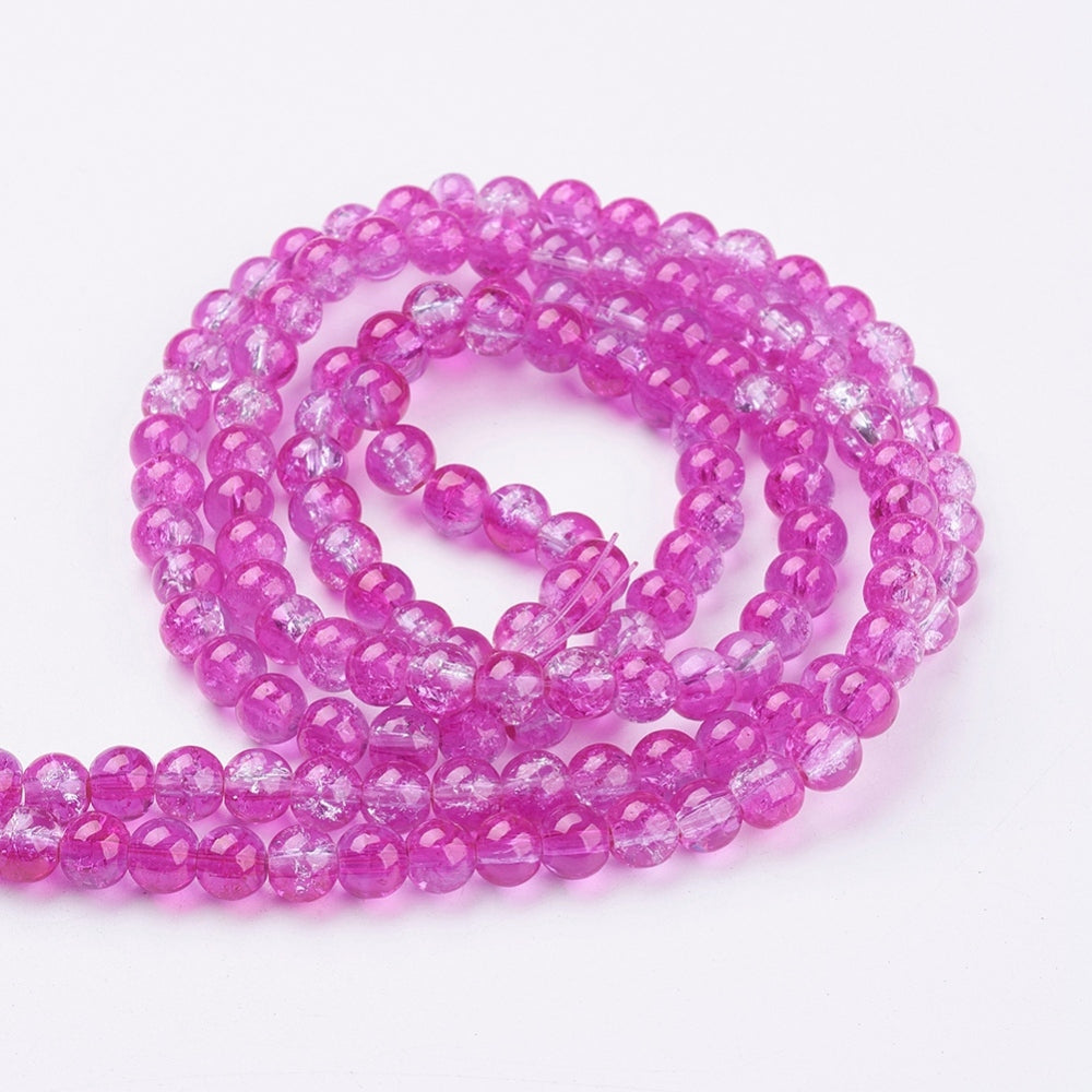 Glass Crackle 6mm Round Pink/Clear 86cm strand approx 140 pcs per strand hole: about 1mm. Crackle beads are heated and rapidly cooled to produce internal crackles. Crackles increase light reflection inside the beads deepening the drama of colour. Size and shape may vary slightly and colour may vary from dye lot to dye lot.