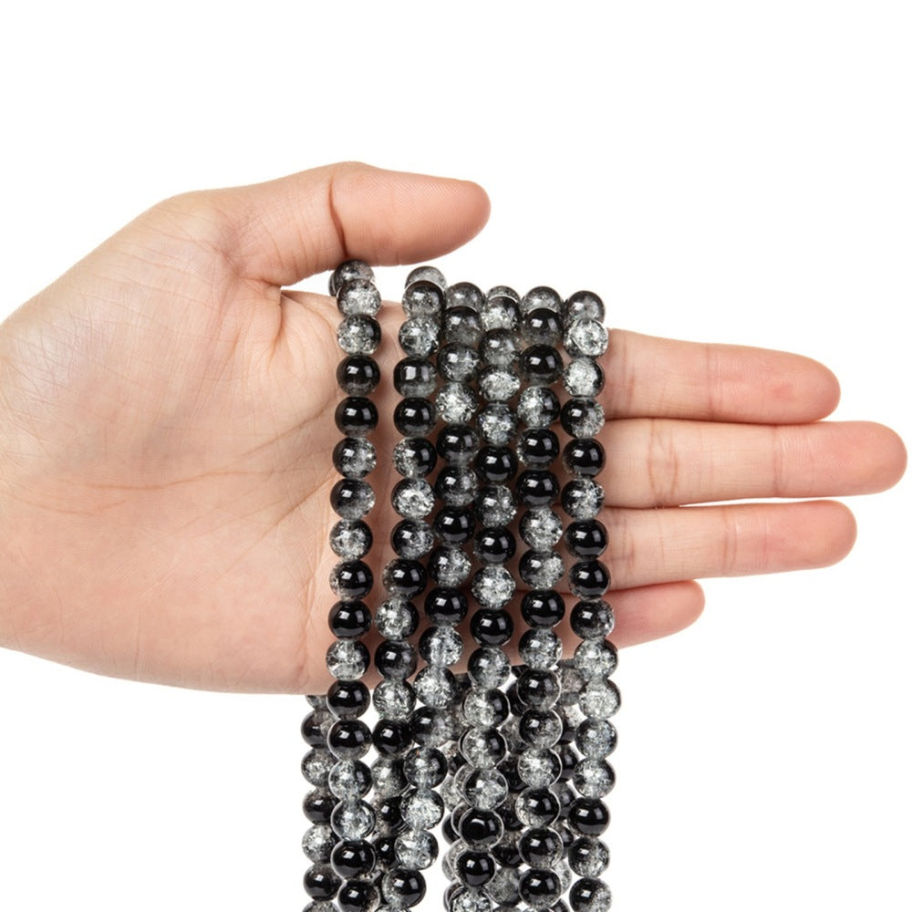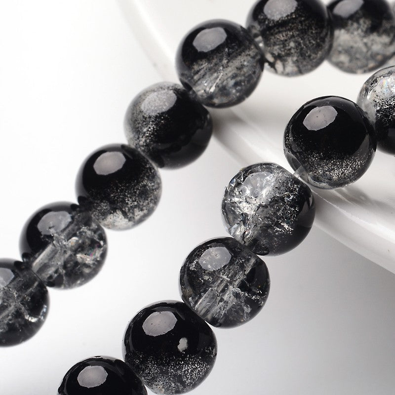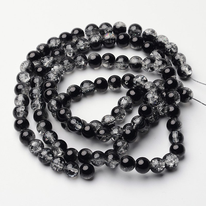 Glass Crackle 8m Rnd Black/Clear 86cm strand approx 105pcs per strand hole: about 1mm. Crackle beads are heated and rapidly cooled to produce internal crackles. Crackles increase light reflection inside the beads deepening the drama of colour. Size and shape may vary slightly and colour may vary from dye lot to dye lot.