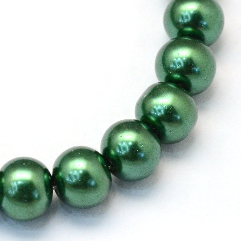Glass Pearl 4mm Dark Green 81cm strand approx 216 pce. These glass pearls in beautiful colours have been coated and are heated for a durable finish. Economical glass pearls offer a hint of elegance at just a fraction of the cost of designer pearls. Colour may vary slightly from dye lot to dye lot.
