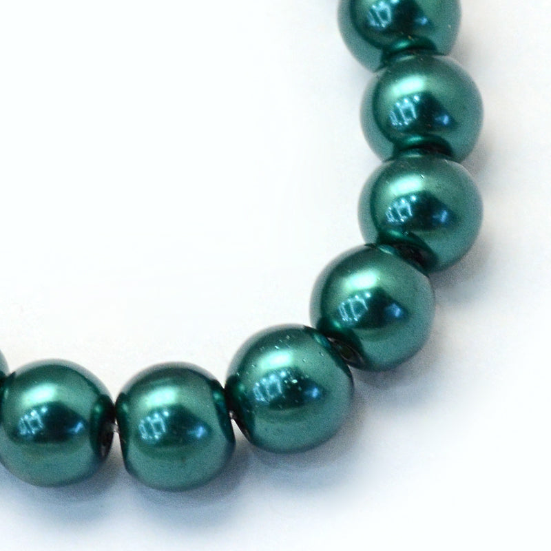 Glass Pearl 8mm Teal 81cm strand approx 110 pce. These glass pearls in beautiful colours have been coated and are heated for a durable finish. Economical glass pearls offer a hint of elegance at just a fraction of the cost of designer pearls. Colour may vary slightly from dye lot to dye lot.