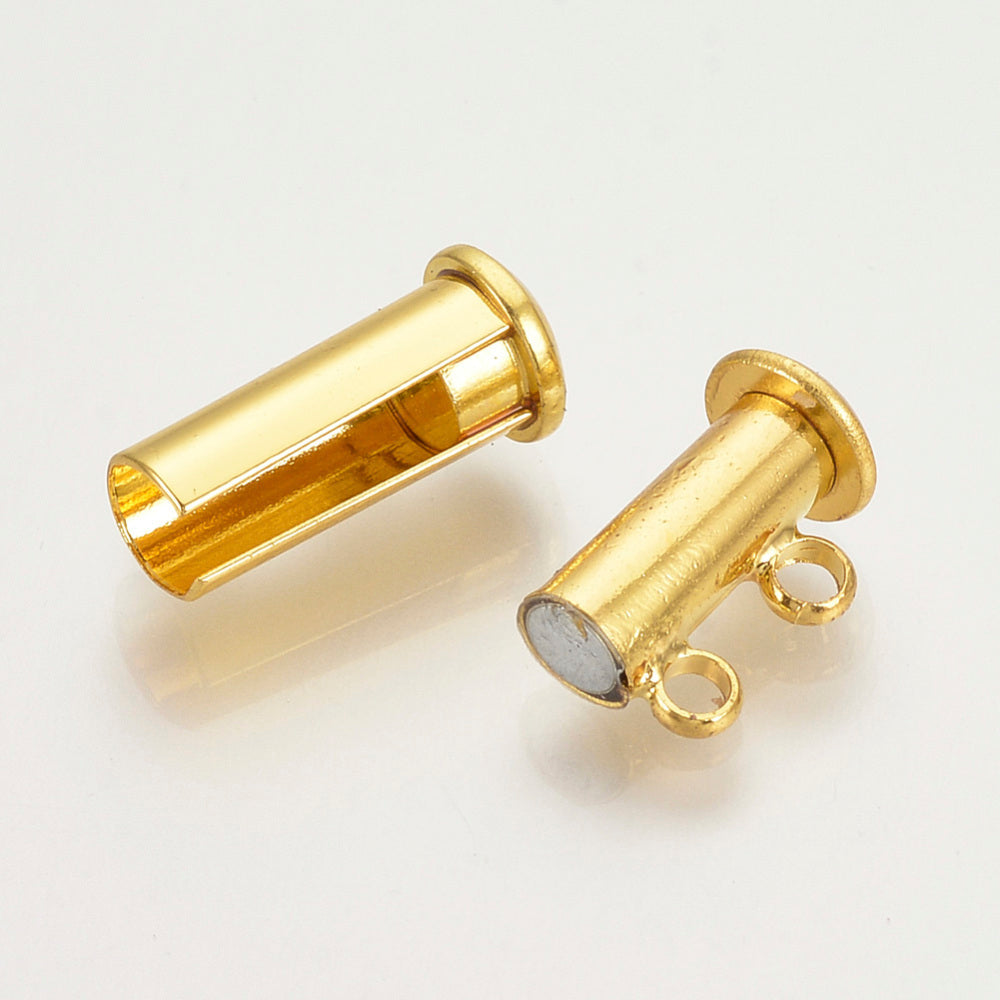 Clasp Slide Lock 2 Strand nickel free gold-plated brass 16x6 tube. Multi-strand plated brass slide clasps in gold finish are easy to open and close with strong, self-latching inside lock.