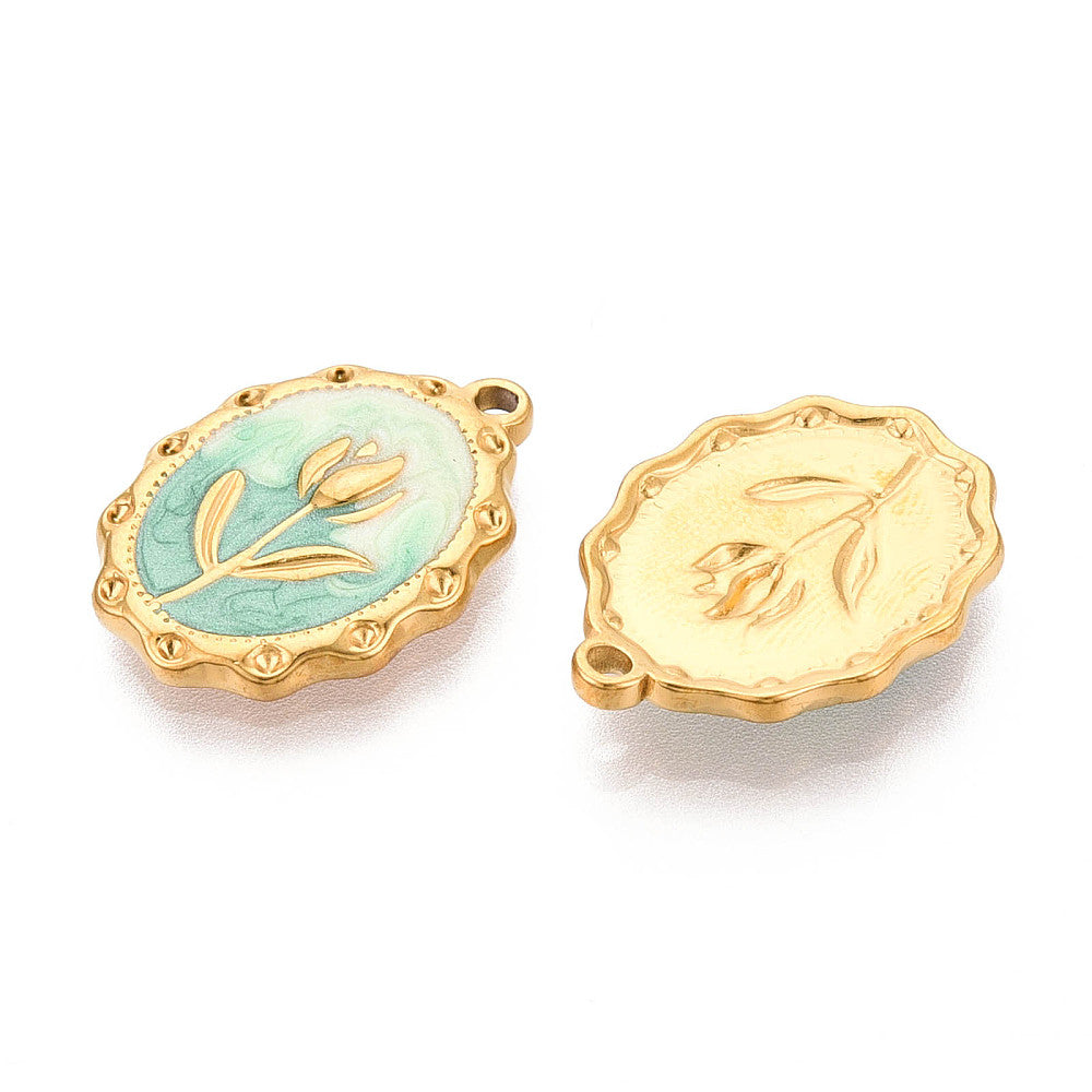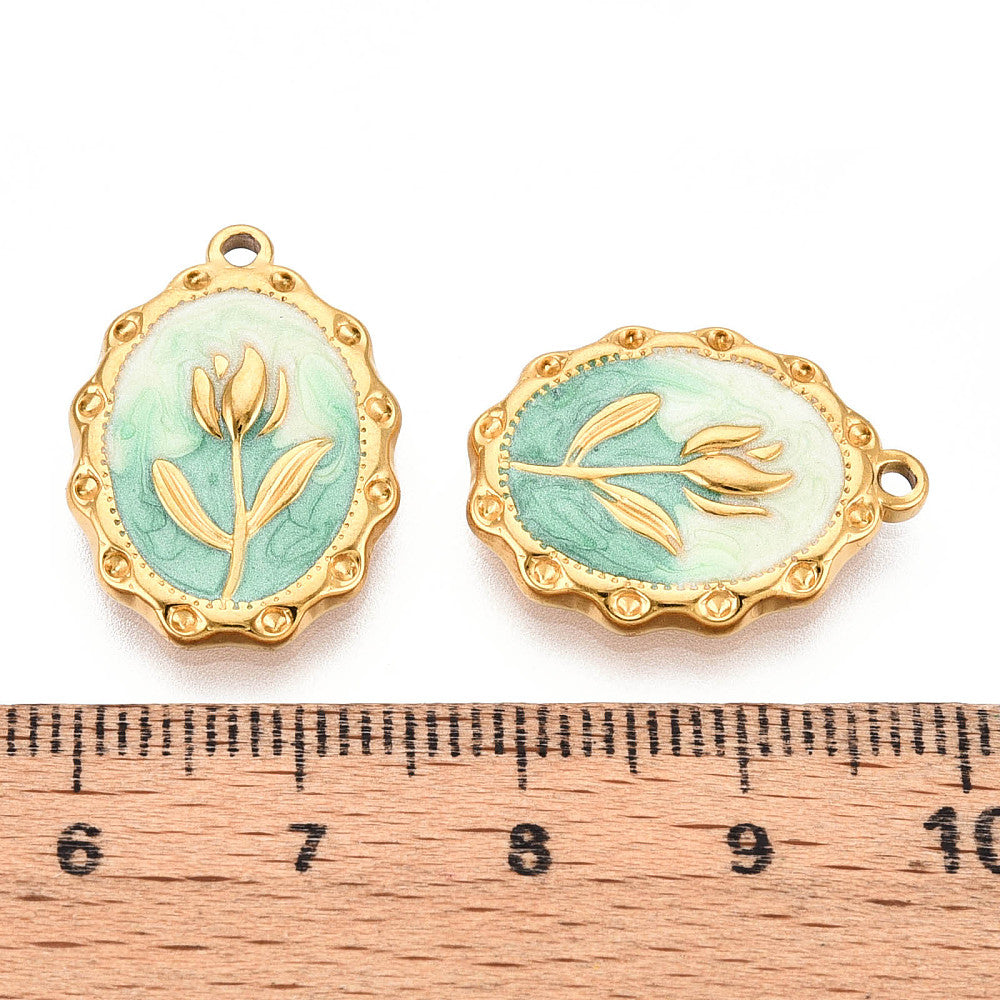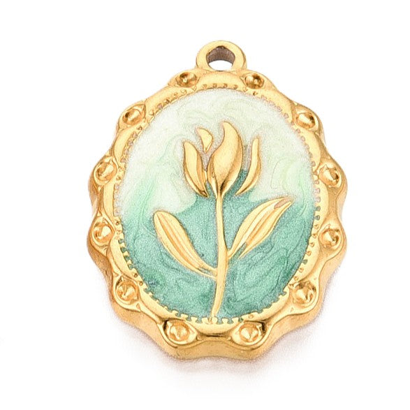 18k Gold Plated Stainless Steel Enamel Flower Frame Sea Green Charm 21.5 x 15mm