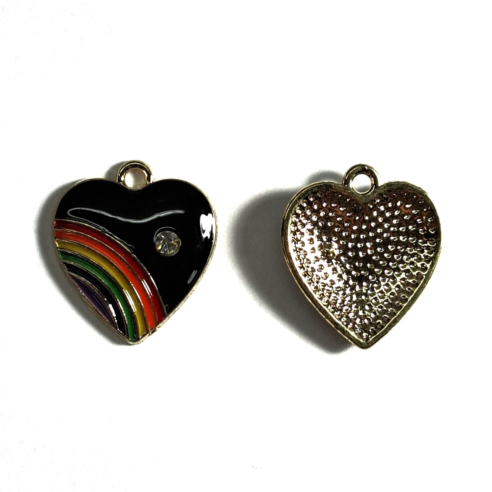 Charm Heart Black 20x18 Enamel with Rainbow and Rhinestone Gold