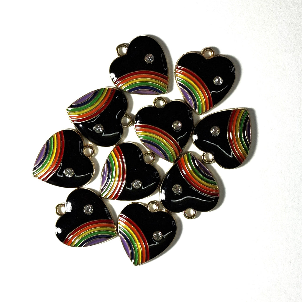 Charm Heart Black 20x18 Enamel with Rainbow and Rhinestone Gold