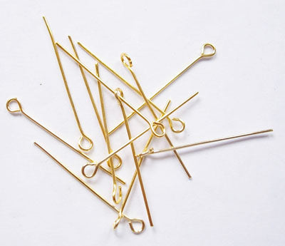 Eye Pin 35mm Nickle Free Gold 10grams A jewellery-maker's staple, Eye pins allow you to make earrings, pendants, links and drop embellishments faster than lightning. Due to the manufacturing process, headpins and eye pins will often arrive bent. However, they are soft metal, so they are easily reshaped.