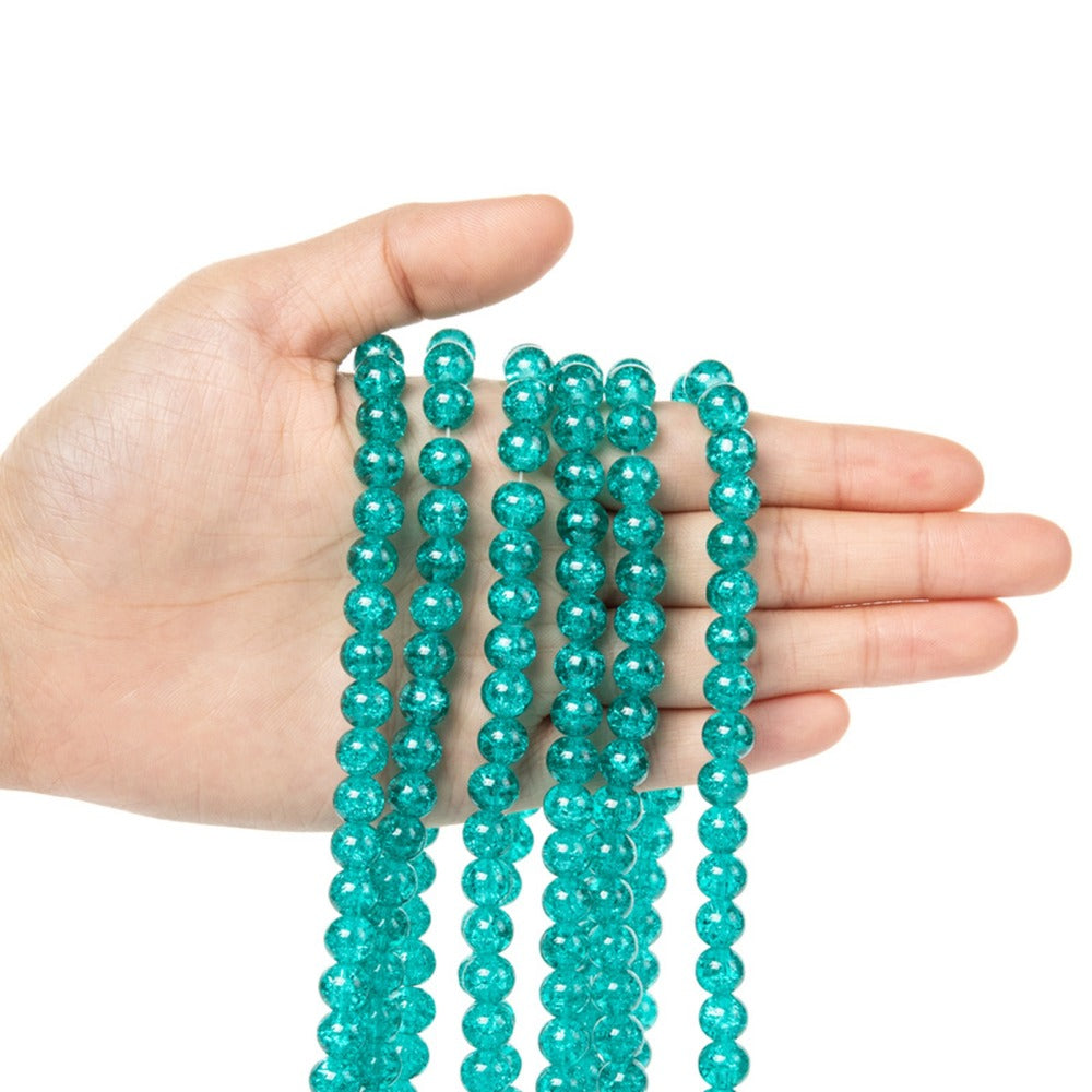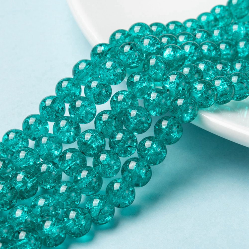 Glass Crackle 8mm Round Teal Glass 86cm strand approx 105 pcs per strand hole: about 1mm. Crackle beads are heated and rapidly cooled to produce internal crackles. Crackles increase light reflection inside the beads deepening the drama of colour. Size and shape may vary slightly and colour may vary from dye lot to dye lot.