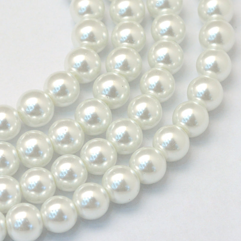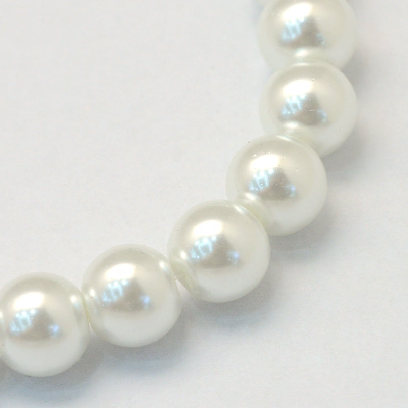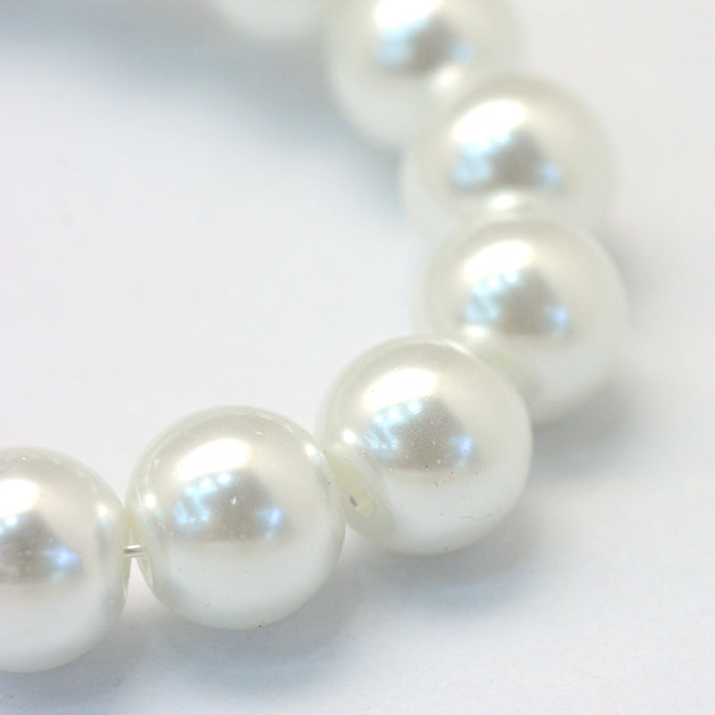 Glass Pearl 8mm White 81cm strand approx 110pce. These glass pearls in beautiful colours have been coated and are heated for a durable finish. Economical glass pearls offer a hint of elegance at just a fraction of the cost of designer pearls. Colour may vary slightly from dye lot to dye lot.