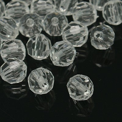Plastic Faceted Beads 8mm Clear AB Per Gram Lightweight acrylic faceted rounds are an affordable alternative to glass beads and gemstones. With faceted surfaces, these beads lend a touch of sparkle to jewellery designs. Due to the manufacturing process, there may be variations on bead size and colour from batch to batch